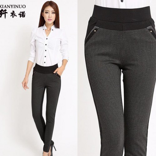 秋冬彈力女褲修身顯瘦大碼女裝打底條紋長褲松緊ab面褲子休閑褲