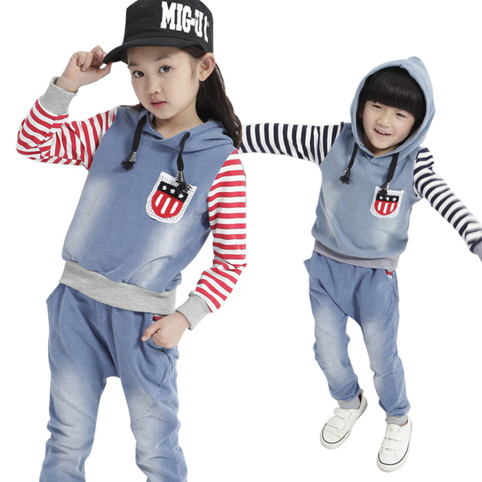 童套裝男女童牛仔條紋運動套裝兒童童裝批發團購