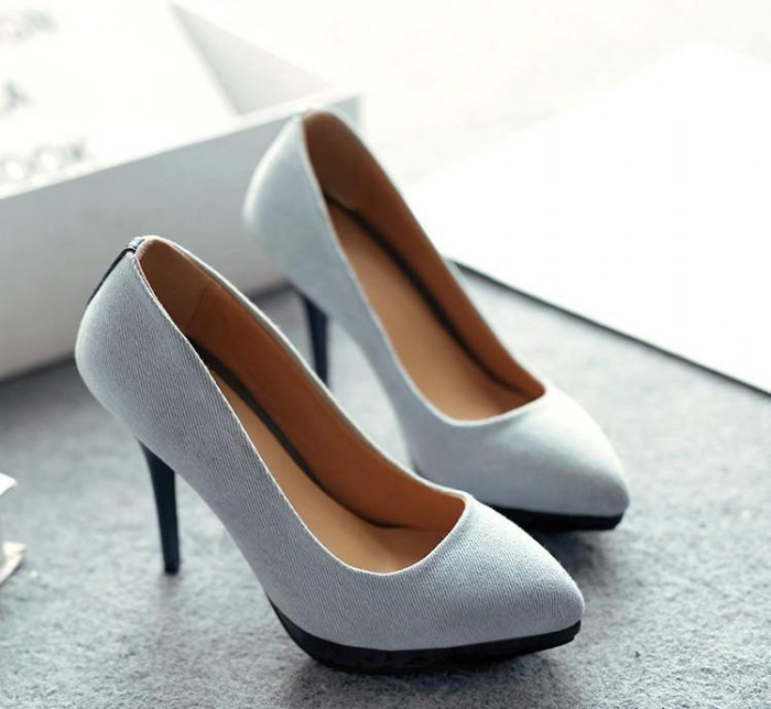 2015春季新款**水洗牛仔布+PU高跟鞋簡潔深藍色淺藍色甜