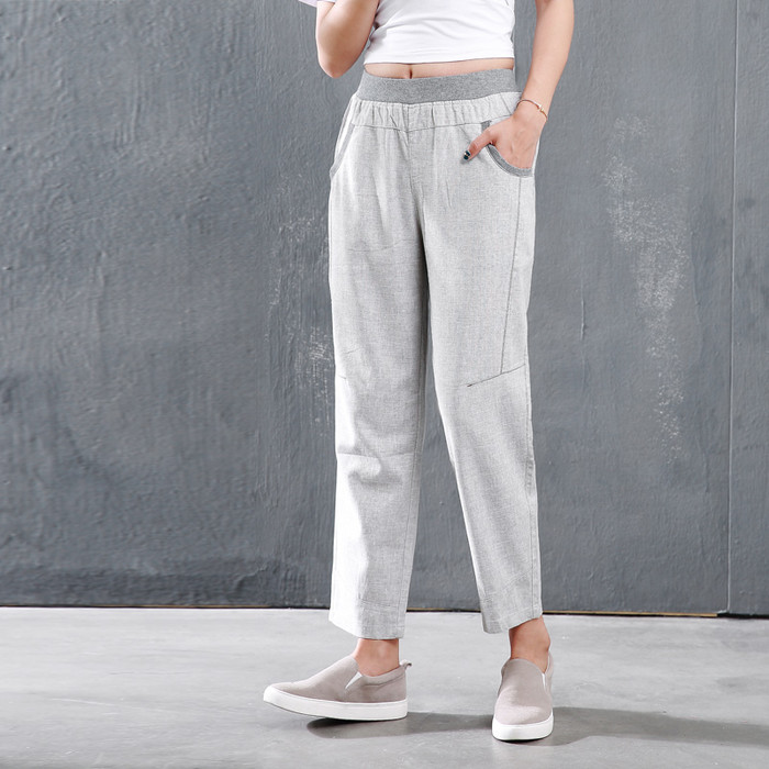材質成分黃麻65% 聚對苯二甲酸乙二酯(滌綸)35%流行元素不對稱褲長九分褲銷售渠道類…
