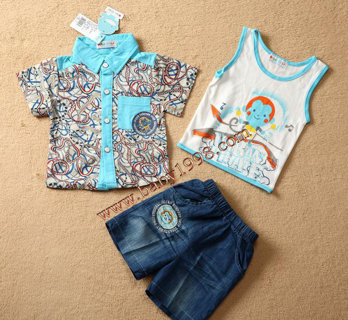 酷咕鴨2015夏裝童套裝 三件套 襯衣+背心+牛仔短褲