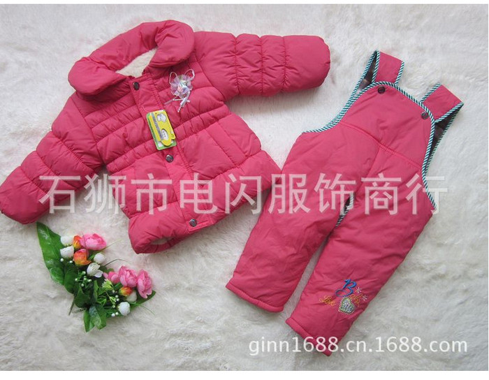 供應2013冬款-開檔女童棉服套裝-吊帶套裝-寶寶加厚夾棉開檔背帶套裝