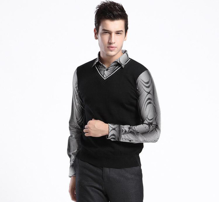 戈德堡2014新款 韓版假兩件針織背心襯衫領 男式套頭休閑針