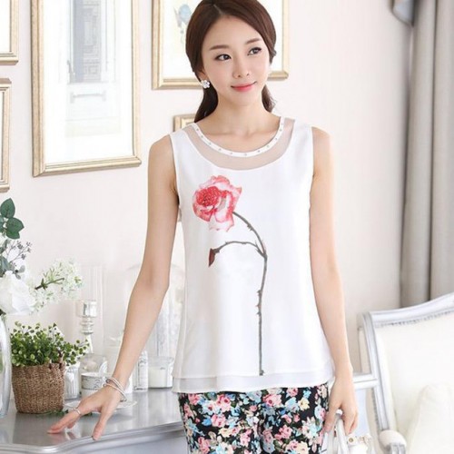 2015夏季新款 韓版 鑲鉆玫瑰花印花背心雪紡衫 女式T恤