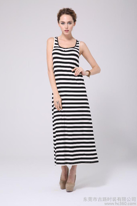 供應GUCIUME2014夏新款歐美無袖吊帶背心條紋連衣長裙批發(fā)