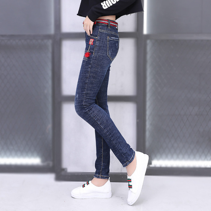 2017秋款時尚修身顯瘦鉛筆褲 韓版印花中腰彈力小腳牛仔褲