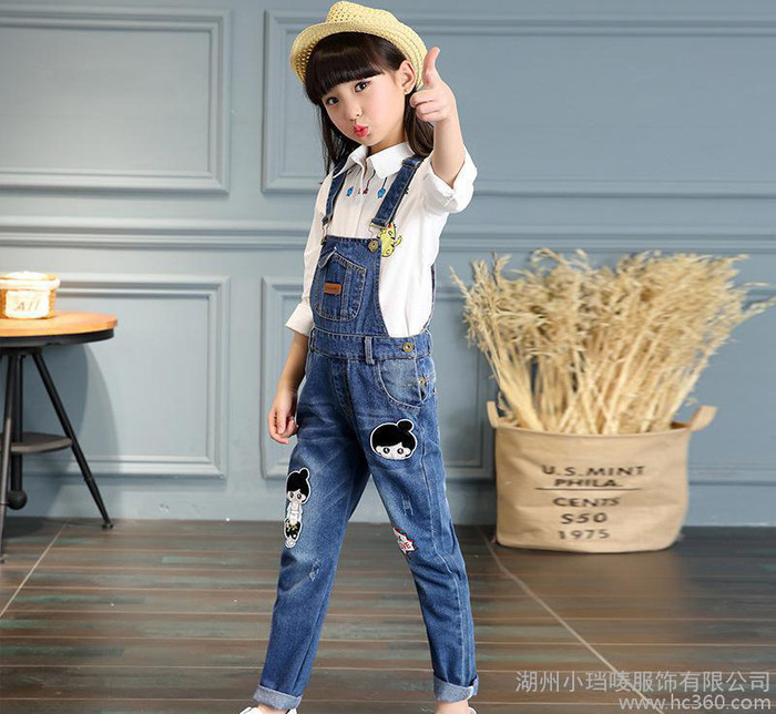 兒童吊帶連體褲水洗藍牛仔背帶褲子女裝韓版連體褲寬松闊腿褲2017