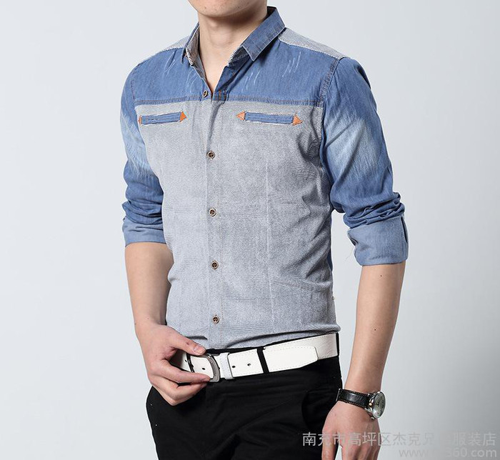2015春秋 男士牛仔長袖襯衫修身休閑時尚百搭潮牛仔衣服男上