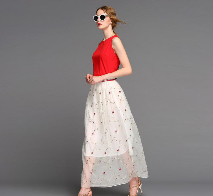 歐洲站2015夏季新款時尚高端女凈色背心網紗繡花半身裙兩件套