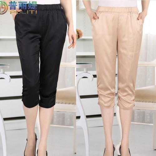 夏季中老年女褲媽媽裝褲子中年人松緊腰仿真絲七分褲純色休閑褲潮