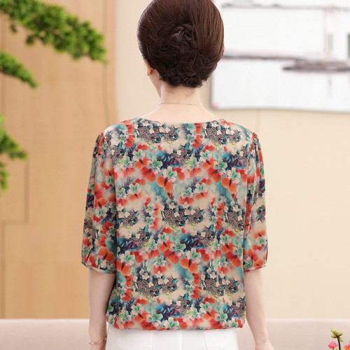 中老年女裝夏季新品圓領(lǐng)印花短袖T恤大碼媽媽裝提花上衣