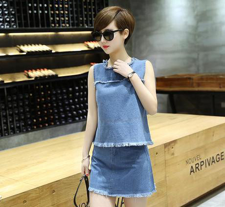 實拍2016新款流蘇無袖牛仔背心上衣牛仔A字短裙套裝裙女