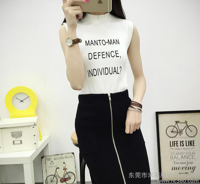 2017夏季冰絲無袖字母印花針織衫背心+ 針織包臀拉鏈裙 812
