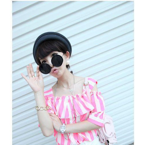 2013新款 熒光色韓國豎條紋 寬 荷葉邊露肩吊帶雪紡衫 一件代發