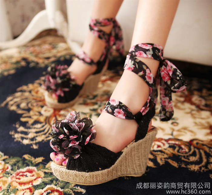 一件代發2013新款韓版甜美淑女雪紡蕾絲綁帶鏤空魚嘴坡跟涼鞋