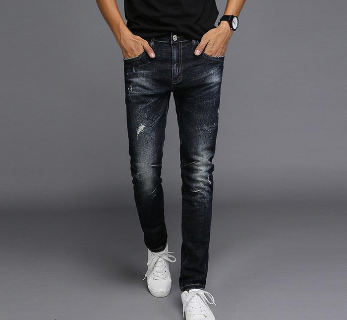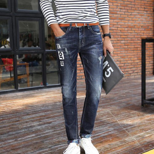 男士小腳褲秋季磨破中腰彈力修身印花學生潮褲卷邊大碼男士牛仔褲