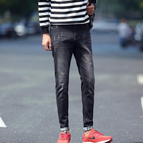秋冬新款男士破洞修身小腳褲男裝牛仔褲 日系青少年男式長褲