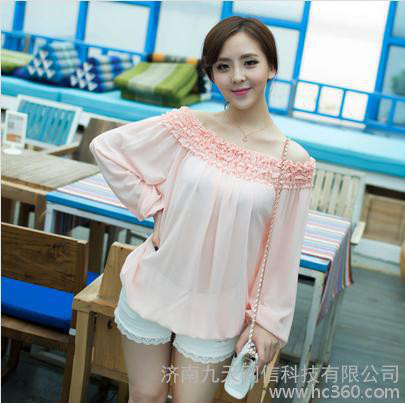 供應2014夏女裝新款韓版甜美靚麗一字領露肩木耳邊褶皺寬松顯瘦雪紡衫