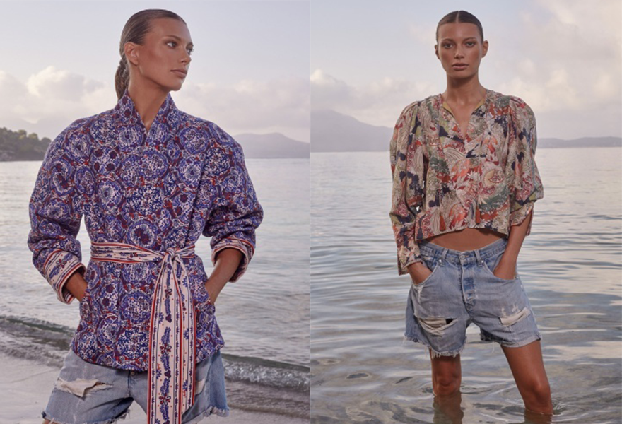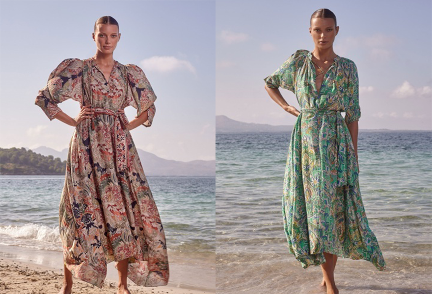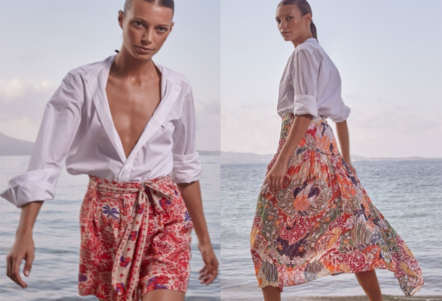 將印花圖案用在下裝之上,紅色、粉色、綠色還有藍色等多種顏色之間的組合搭配,在撞色中民族風情更濃厚了幾分,輕薄的面料和飄逸的裙擺結合在一起更為明顯;