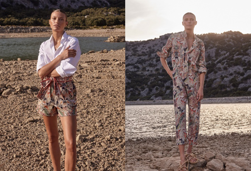 印花的服裝中,花紋圖案的排列很密集,緊實的排列在視覺上顯得就略顯雜亂了一些,而這些V字的衣領、開叉的裙擺等顯露出了肌膚之色,在這密集的印花之中,膚色的純色可以作為留白的存在,和印花的面料之間加上一層對比關系;