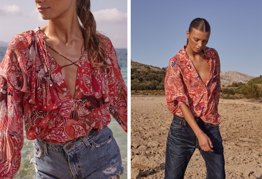 紅色的顏色作為了這兩套印花上衣的底色,不過粉色與深色裝飾的圖案,看起來并沒有其他圖案的太強張力,相對來說會感覺更為日常一些;