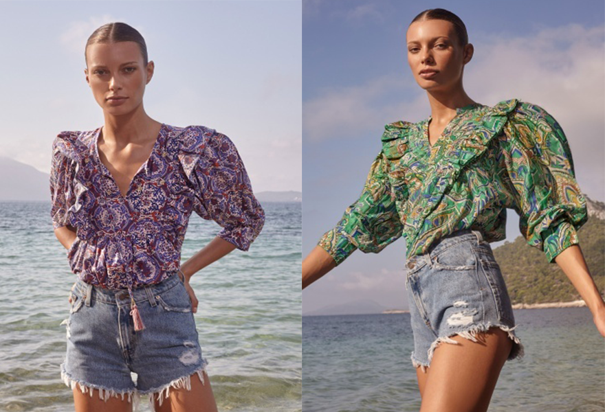 將滿滿的印花圖案用在上衣之中,與V字的衣領、拼接的荷葉邊、還有夸張感的袖子等部分結合起來,印花的上衣有了更多的造型感和吸睛的亮點;尤其是夸張感的袖子和荷葉邊的部分,還多了一些浪漫;