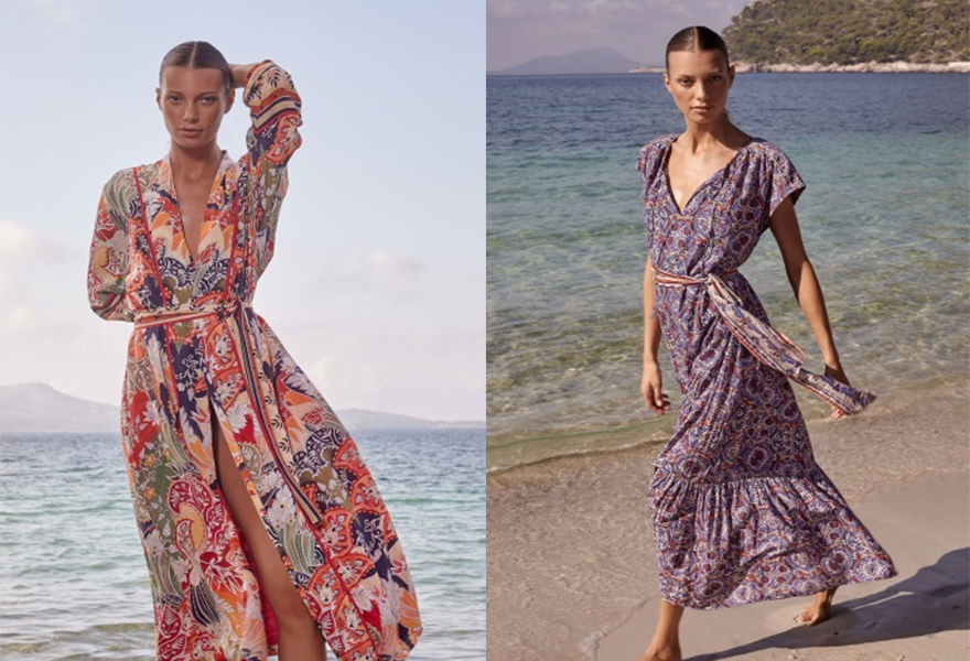 印花圖案的連衣裙上與V字的衣領、還有夸張一些的特色肩部等這些造型很好的結合在了一起,更在其中加入了相同配色、相同面料質感等的腰帶,讓其增加了修身的視覺效果,在修身中,腰身的展現更為完美;而柔軟的面料卻在海風的吹拂中,肆意的搖動著裙擺;