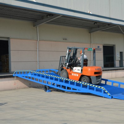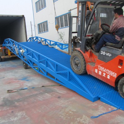 移動式液壓登車橋是與叉車配合使用的貨物裝卸專用輔助設備,有了它,叉車能直接從地面使入汽車車廂內部進行批量裝卸作業,產品采用人工液壓動力,不需再接動力電源,只需單人操作,即可實現貨物的安全快速裝卸,它可以使企業減少大量勞動力,成倍提高裝卸作業效率,加快貨物流通速度,讓使用公司獲取更大的經濟效益。