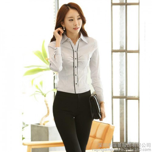 此款為白色OL風(fēng)格女士OL風(fēng)格職業(yè)裝女性襯衫,版型非常好,貼身設(shè)計(jì)特別收腰,款式簡單時(shí)尚大方而不庸俗。職業(yè)而不呆板,在休閑工作、面試、見客戶等場合也非常適用。