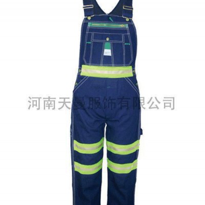 全棉靛藍牛仔布;背帶可調節;一個拉鏈胸兜,多個工具兜,后背臀部貼兜,兩個斜插褲兜;腰部可調節松緊;腰部和褲腿帶有反光條。